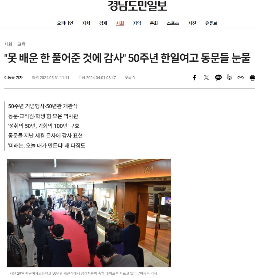 여성교육 큰 획 그은 한일여고, ‘50년 발자취 담은 역사관’ 개관식_경남일보