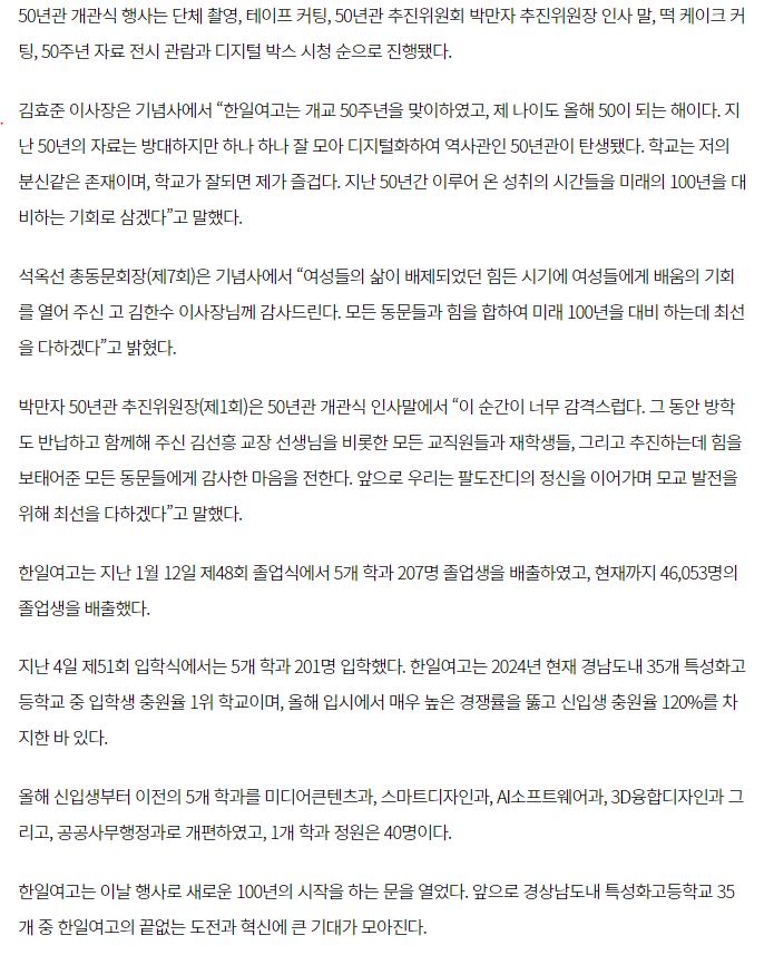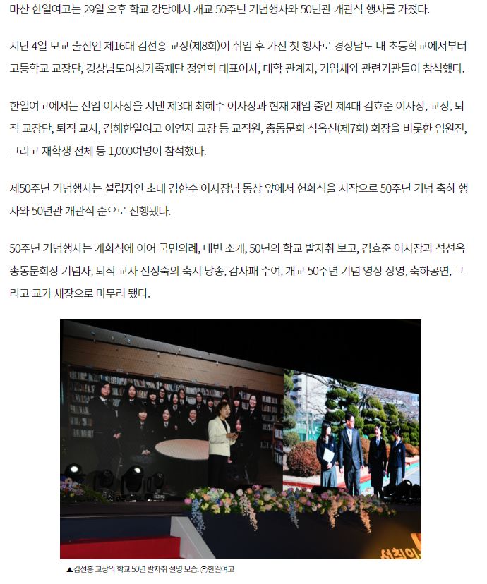 한일여고 개교 50주년과 50년관 개관 기념식 열어 총동문, 퇴직 교사 등 1000여명 참석 ‘대성황’_프레시안