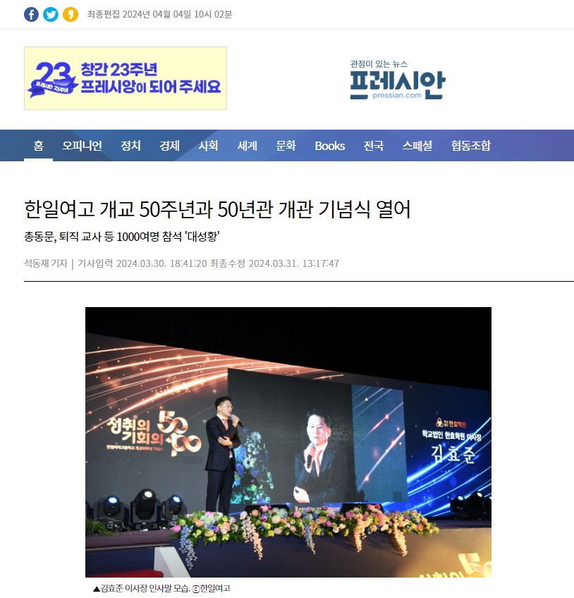 한일여고 개교 50주년과 50년관 개관 기념식 열어 총동문, 퇴직 교사 등 1000여명 참석 ‘대성황’_프레시안 상세 보기